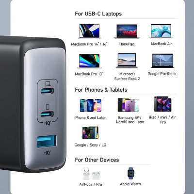 - Ultra High-Speed Charging: Provide a powerful charge for a huge-range of laptops including the 2021 MacBook Pro 14” (M1 Pro), HP Spectre x360, Dell XPS 13, and more when you connect to either USB-C port.