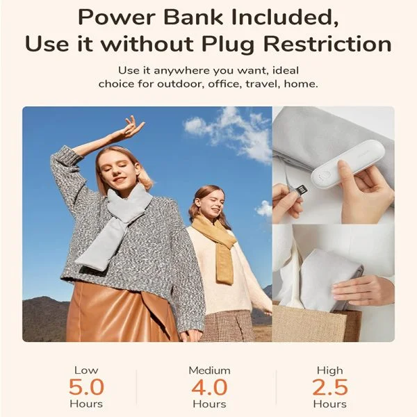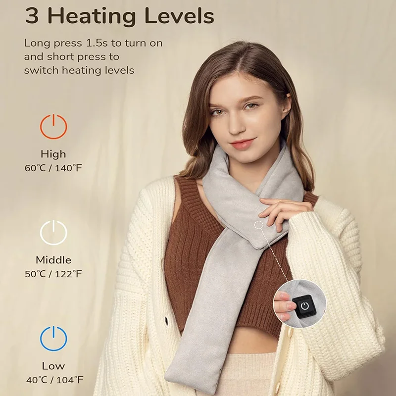 - 3 Steps to Use Step 1: Connect the power bank to the USB port of the scarf. Step 2: Turn on the power bank; Step 3: Press the switch for 1.5 seconds to turn it on and off, press it briefly to change the levels. Note: The heated scarf has a 45 minute automatic shut-off to prevent overheating.